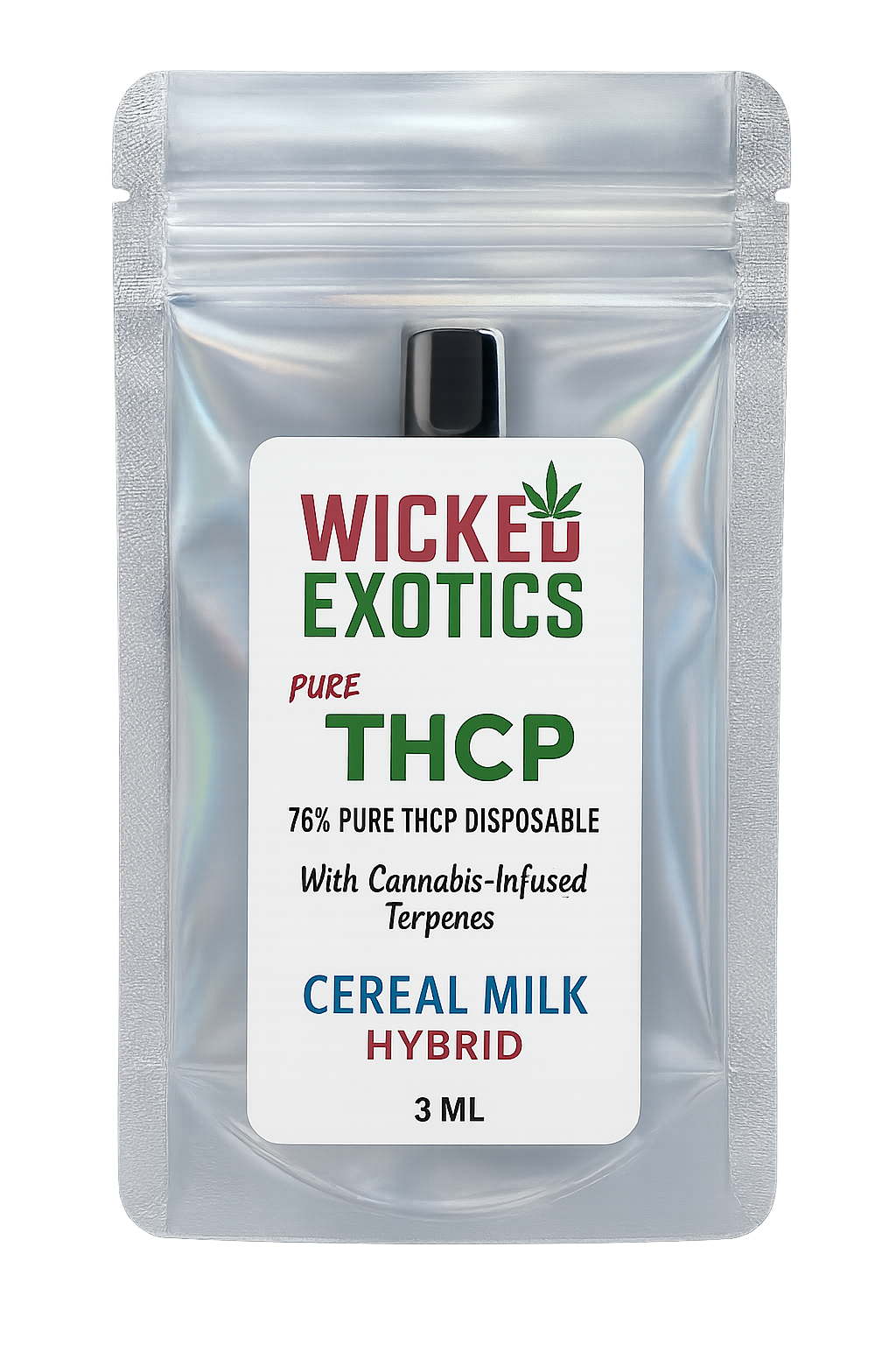 Experience next level potency with our Wicked Exotics THCP Disposables, crafted with 76% pure THCP for a powerful, ultra smooth hit every time. Each disposable is infused with cannabis derived terpenes for rich, strain authentic flavor and a clean, flavorful inhale. Perfect for anyone looking for a long lasting, high potency option, these THCP vapes deliver strong effects, consistent performance, and zero maintenance. Just open, inhale, and enjoy premium hemp derived THCP made for serious elevation.